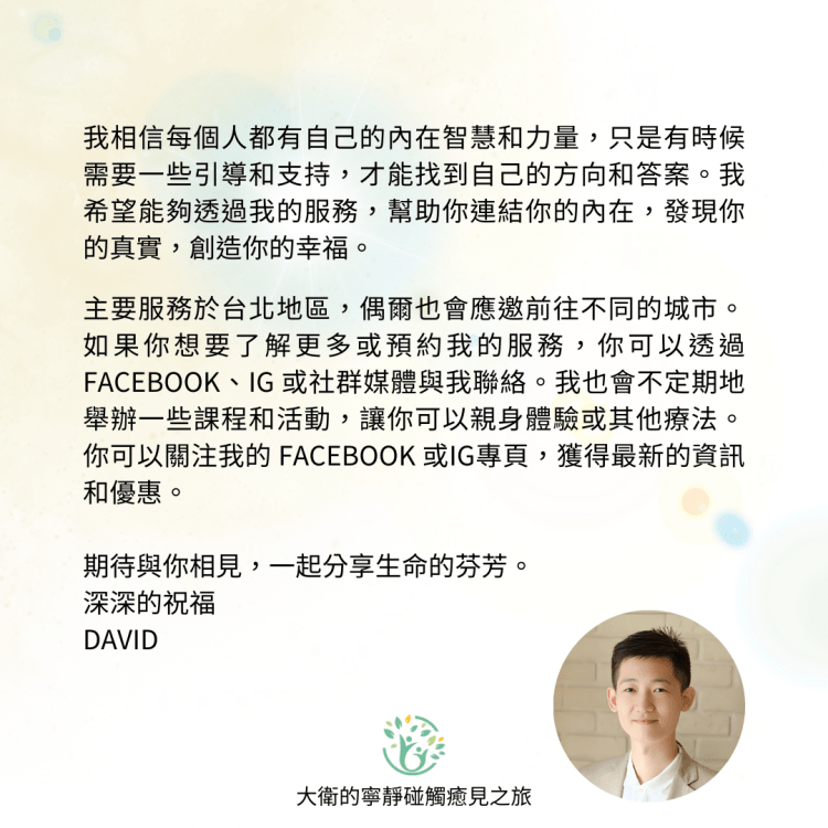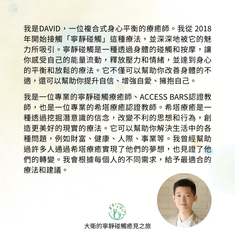 我是David,一位身心靈整合療癒師,透過寧靜碰觸與多元療法,陪你靠近真實的自己。