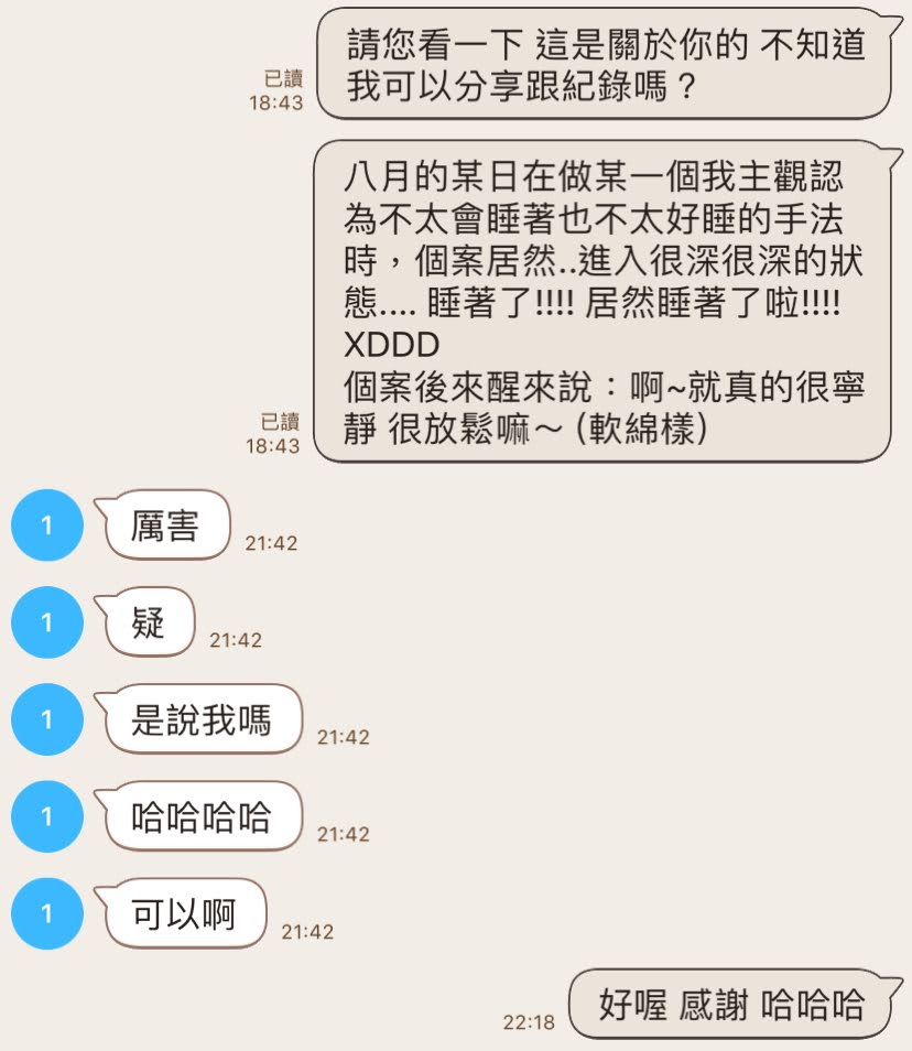 八月的某日在做某一個我主觀認為不太會睡著也不太好睡的手法時,個案居然..進入很深很深的狀態…. 睡著了!!!! 居然睡著了啦!!!! XDDD