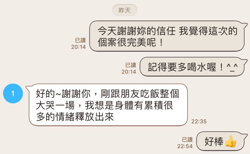 老樣子,完成個案後我都會提醒一下要記得多喝水,然後個案就蹦出這樣的回饋,真心為這位個案感到開心! 不過也辛苦她的朋友了,希望這情緒的釋放不會嚇到她的朋友^^"